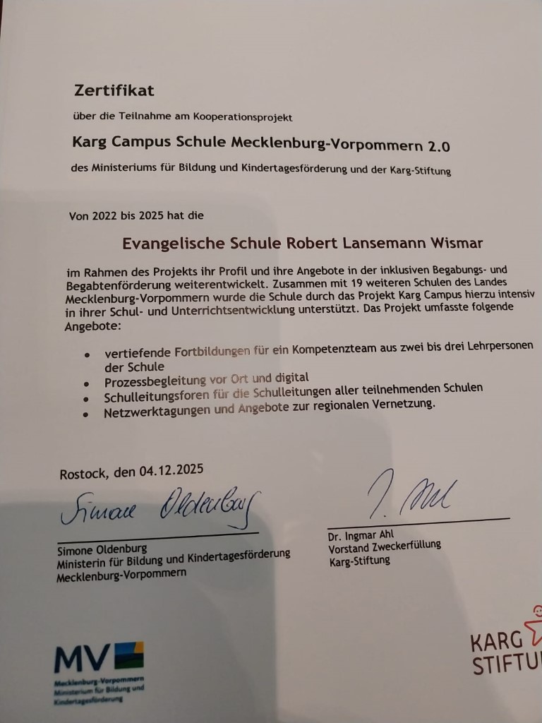 Als Teilnehmer der Initiative erhielt unsere Schule gestern in einem Festakt das Zertifikat über die Teilnahme an diesem Kooperationsprojekt des Ministeriums für Bildung in Mecklenburg-Vorpommern und der Karg Stiftung. Damit wurde uns bestätigt, dass wir ein Schulstandort sind, an dem Begabung in besonderem Maße gefördert wird. Zusammen mit 19 weiteren Schulen des Landes Mecklenburg-Vorpommern haben wir uns auf den Weg gemacht, die inklusive Begabungs- und Begabtenförderung weiterzuentwickeln. Dadurch wurde unser Profil gestärkt, um Kinder in ihren unterschiedlichen Voraussetzungen zu fördern und zu fordern.